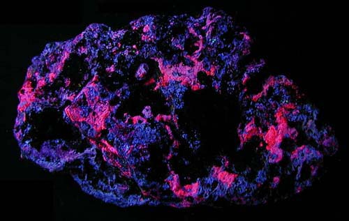 | From Miller Canyon in the Huachuca Mountains, Arizona, an unusual combination of violet Smithsonite and pink/red Calcite. The top picture shows the response under shortwave UV. The lower picture shows the response under longwave UV where the Smithsonite is a creamy white color. Dimensions are 3 1/2 x 2 x 1 inches. Price: $25 |
